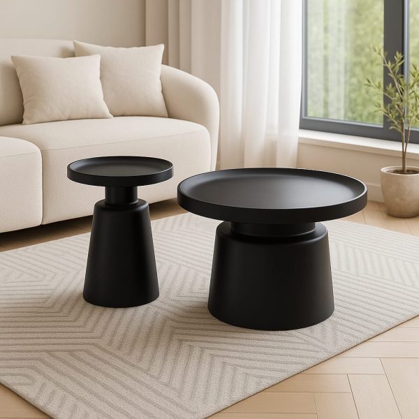 השולחן שבתמונה הוא פריט עיצוב מודרני ומרשים, בעל מראה פיסולי ומינימליסטי. הוא עשוי בגוון שחור מט, עם בסיס גלילי חלק שמעניק לו יציבות ונוכחות, ומעליו משטח עגול ושטוח. ישנם שני שולחנות בגבהים שונים—אחד גבוה וצר יותר, והשני נמוך ורחב—מה שיוצר דינמיקה מעניינת ביניהם ומאפשר שימוש גמיש בחלל.