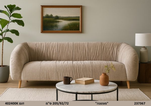 • הספה משתלבת בצורה מושלמת עם העיצוב הכללי של החדר — קווים נקיים, צבעים טבעיים, ושימוש בחומרים כמו עץ, סיבים טבעיים וקרמיקה.