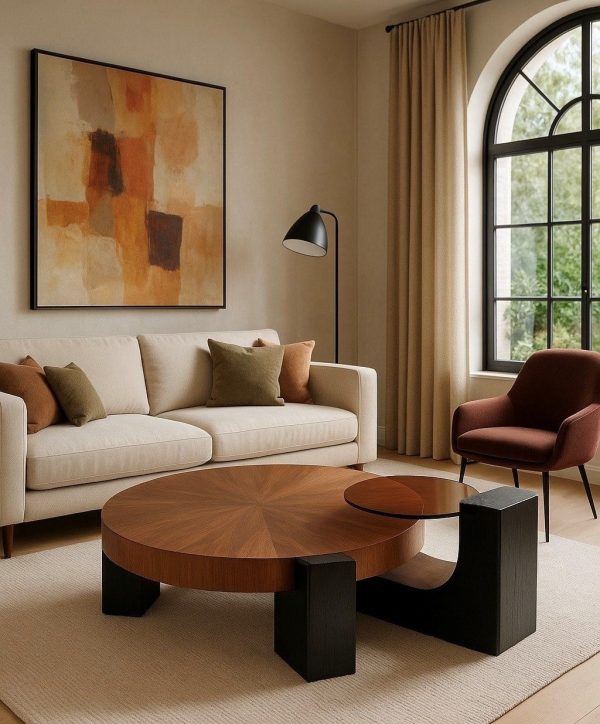 השולחן עשוי עץ בגוון אגוז אמריקאי, עם מבנה עגול שמשדר חמימות ואלגנטיות.