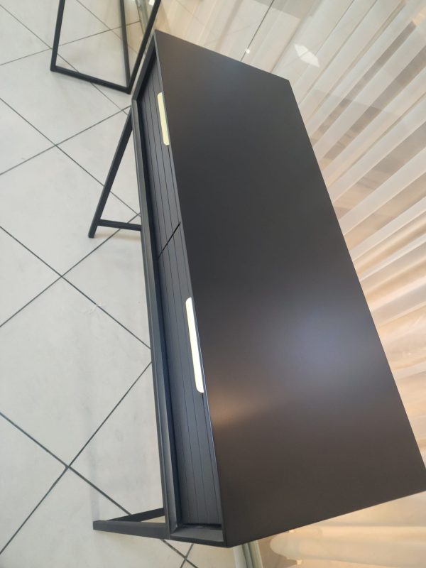 קונסולה עץ בצבע שחור מגירות חזית פסים לרוחב בחיתוך CNC על מסילות ברזל פתיחה וסגירה מנגנון שקט